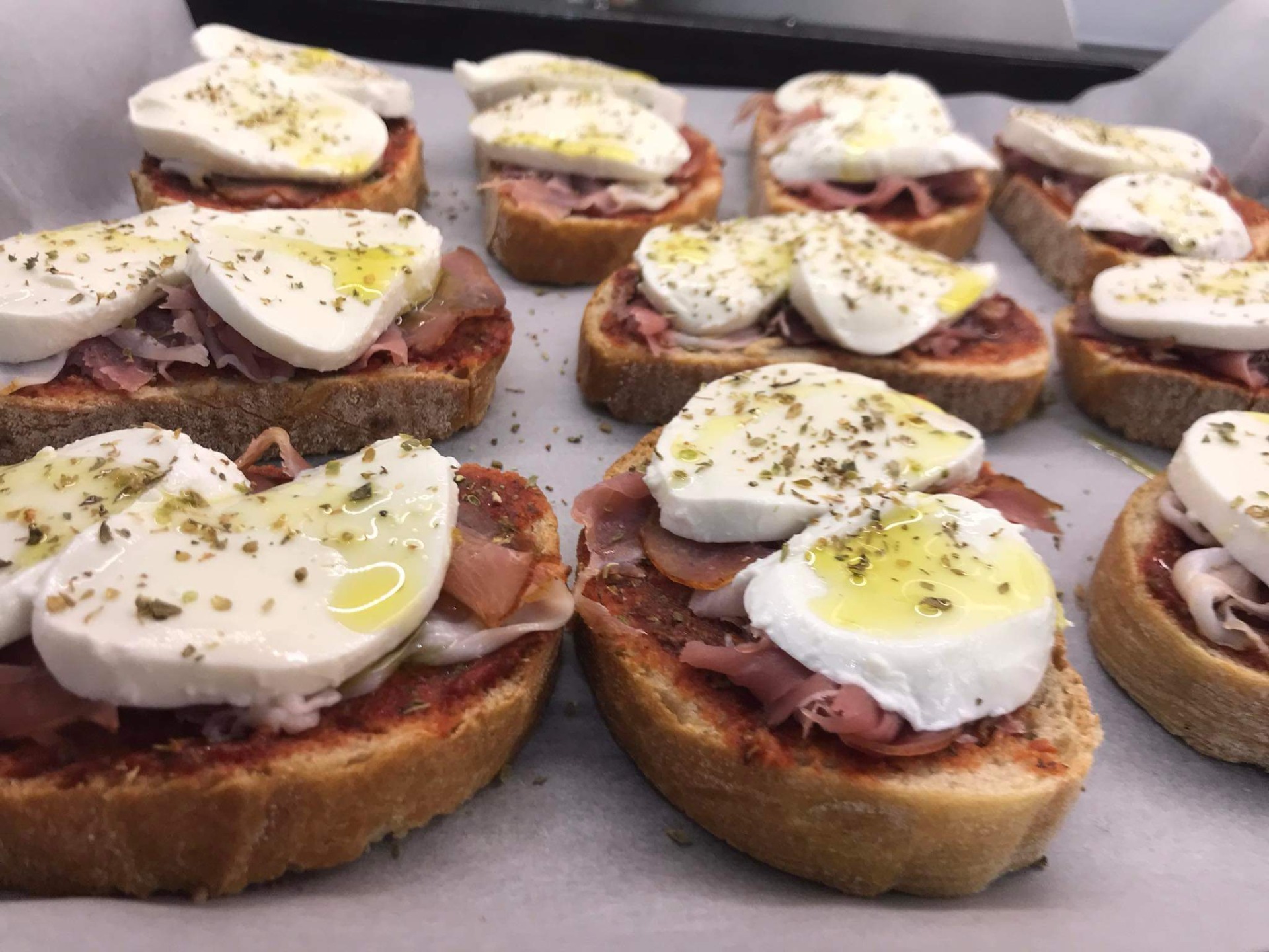 Zmiešame si paradajkový pretlak so sušeným oreganom, troškou olivového oleja a pretlačeným cesnakom. Potom toto pesto natrieme na krajce kvaskového chleba, ktorý rozložíme na plech na papier na pečenie.